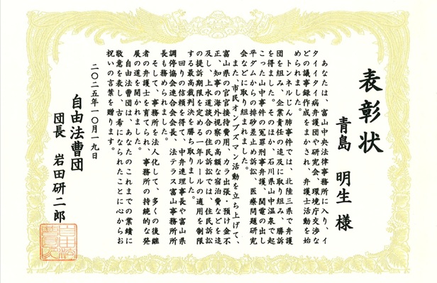 下に掲げた表彰状には、私の40年間がよくまとめられています。これは、いい機会だと思ってまとめた古希団員記念文集への私の投稿と、事務所の後輩の推薦文とを、団長がよく読んで著してくれたもので、大変有り難く思いました。